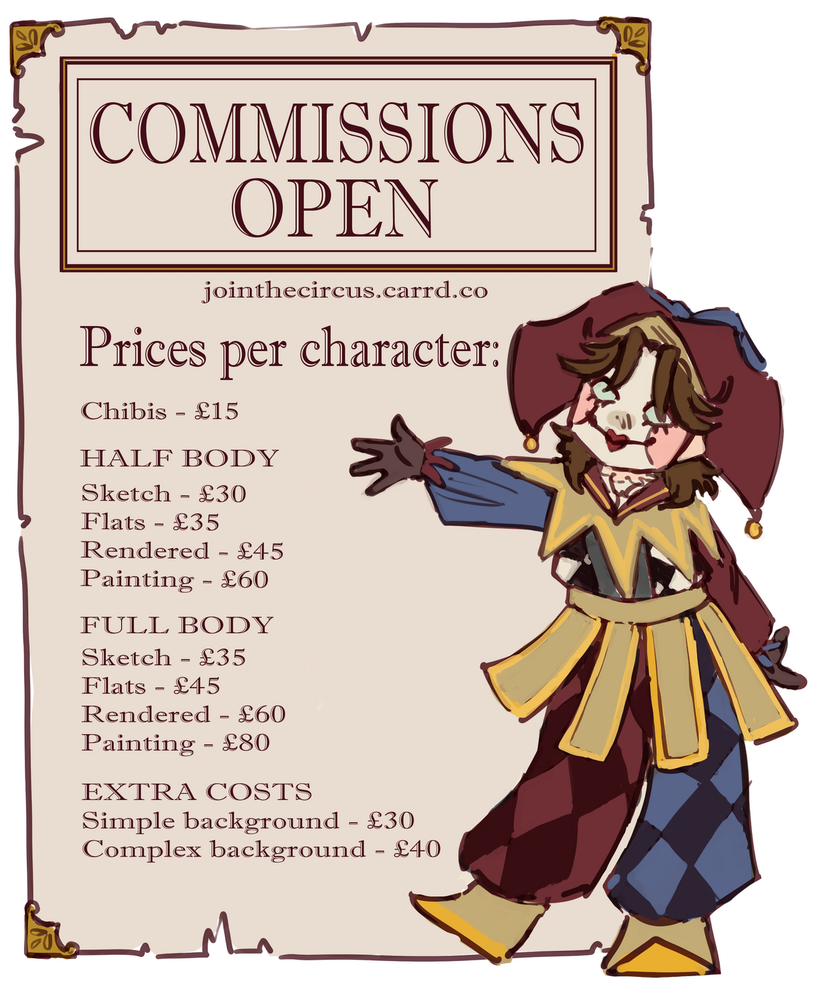 Backgrounds (as mentioned), armour (+25% price for sketch or flats, +30% for rendered), Detailed characters (to be discussed but usually between £10-20).1) Payment through PAYPAL only, upfront. Half upfront can be discussed for prices >£100. A full refund will be issued if I cannot complete your order for whatever reason.2) Please don't rush me, I will try my hardest to get your commission complete asap but I'm still completing my education and I am only one person so please be patient.3) For personal use only. You cannot reproduce/use the copyrighted art commercially (make money from it in any way). You also cannot claim my work as your own or post without credit to me.4) To commission me you must be okay with me posting the artwork on my social media and possibly using it for my art portfolio, if you really don't want me to use your commission this can be discussed beforehand.5) You can commission multiple artworks at one time if the amount of open slots allows for it, but please keep in mind I only have until September available to complete all my commissions.6) I reserve the right to cancel an order and issue a refund at any time.7) I also reserve the right to refuse to accept your commission for whatever reason I see fit8) It is not my job to do the conversion in your own currency.If you have any questions my dms are always open!